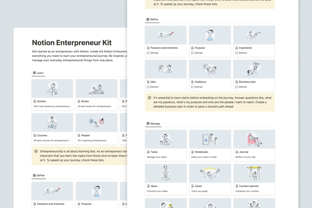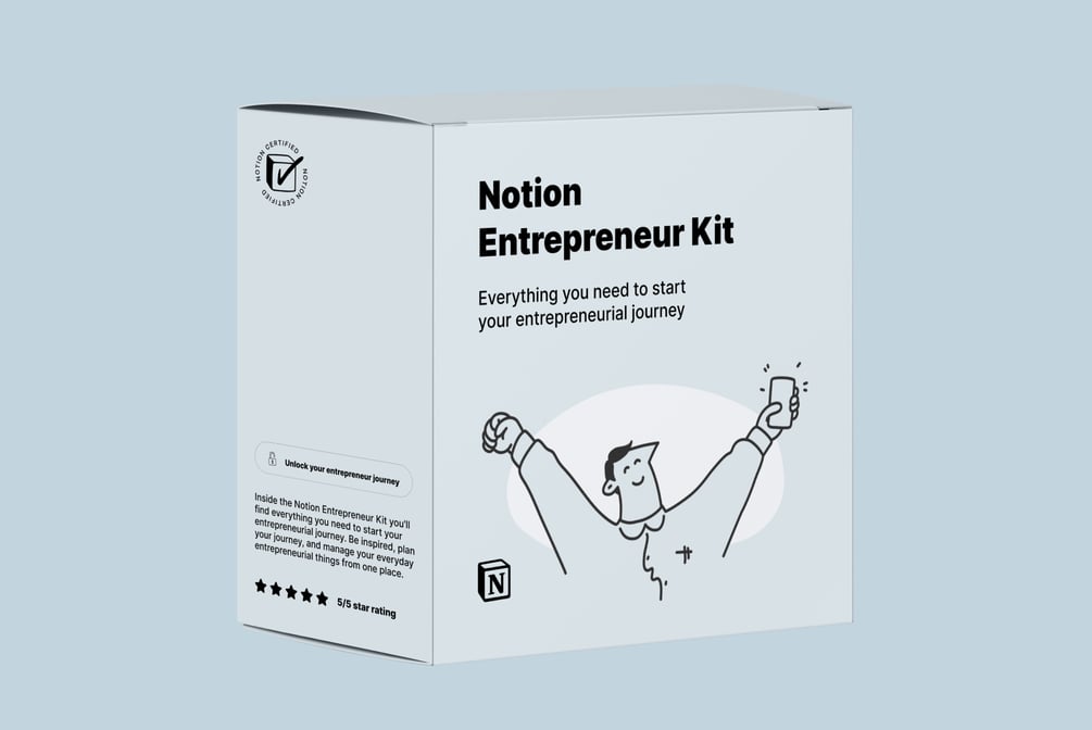 Get started as an entrepreneur with Notion. Inside the Notion Entrepreneur Kit you'll find everything you need to start your entrepreneurial journey. Be inspired, plan your journey, and manage your everyday entrepreneurial things from one place.