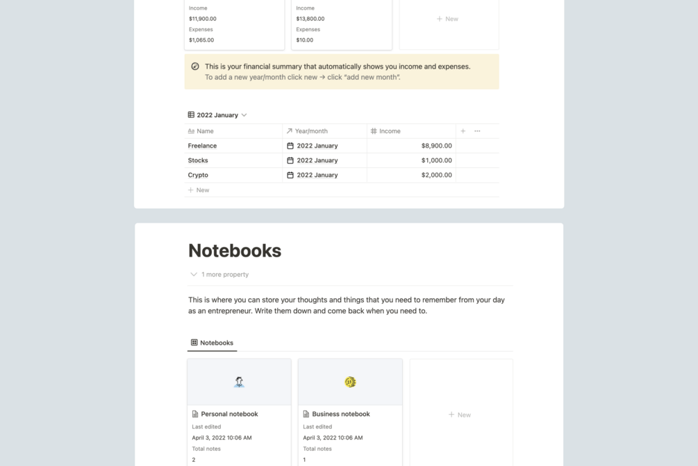 Manage your entire entrepreneur life in one place. Every part of your daily life - tasks, goals, finances, etc. is covered inside this kit.