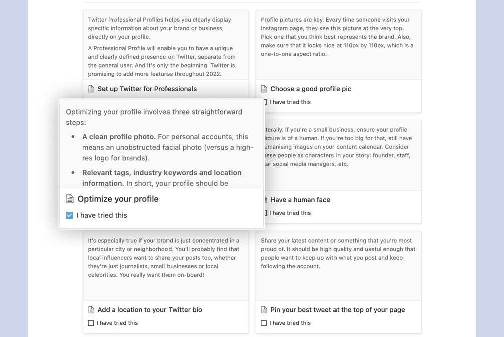 Ease the process of evolving on social media with actionable social media tips from this Notion Social Media Kit. You will find 240+ tips for success on Twitter, Instagram, Facebook, Linkedin, Pinterest, TikTok, or Youtube. Use them one by one and see what works best for your business or personal brand success.