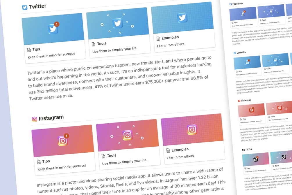 Become a guru of social media by using some of the 100+ best tools for different social media channels. Learn from other successful accounts - adapt your profiles with knowledge gained from 100+ examples. Also, get to know all the most important social media definitions. All of that is in this one Notion Social Media Kit!