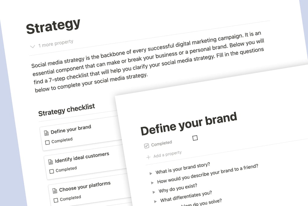 Create your social media strategy for your business or personal brand by answering questions inside this template. You will find 7 sections with more than 50+ questions in total that will help you clarify your social media strategy step by step.