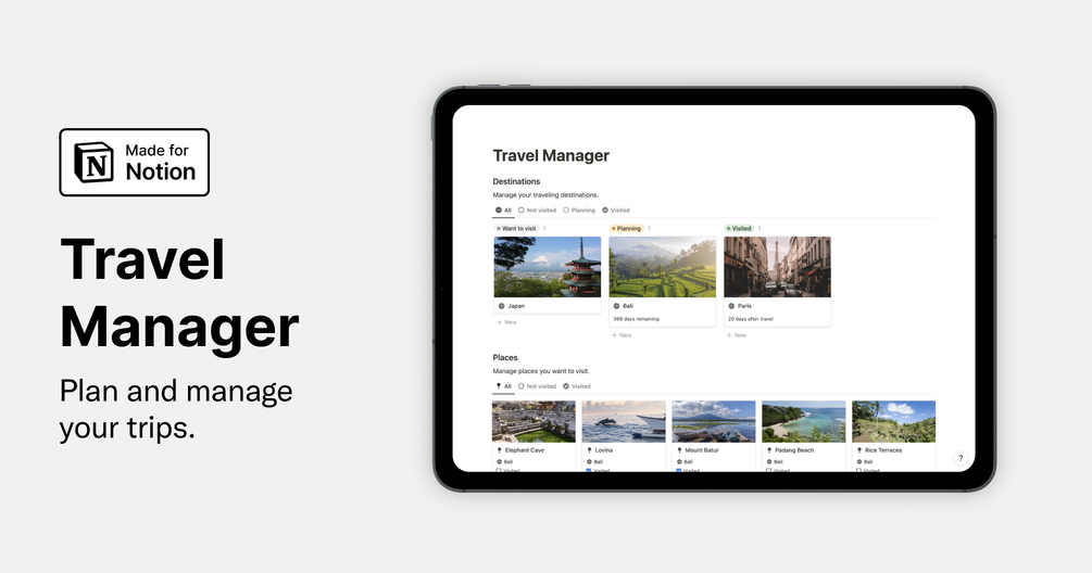 Use this Notion Travel Manager to keep track of all your travels and plan even better new ones.